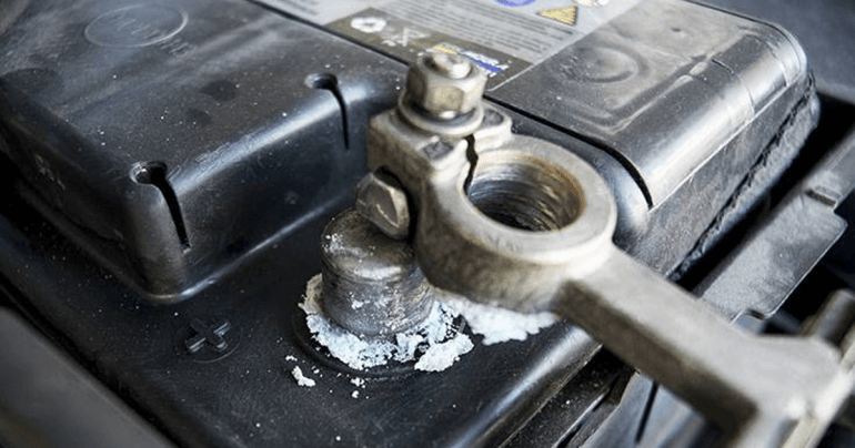 Este material é formado devido a reação química entre o oxigênio do ar, o ácido sulfúrico que a bateria contém e o metal do terminal conector do cabo ou dos polos da bateria.